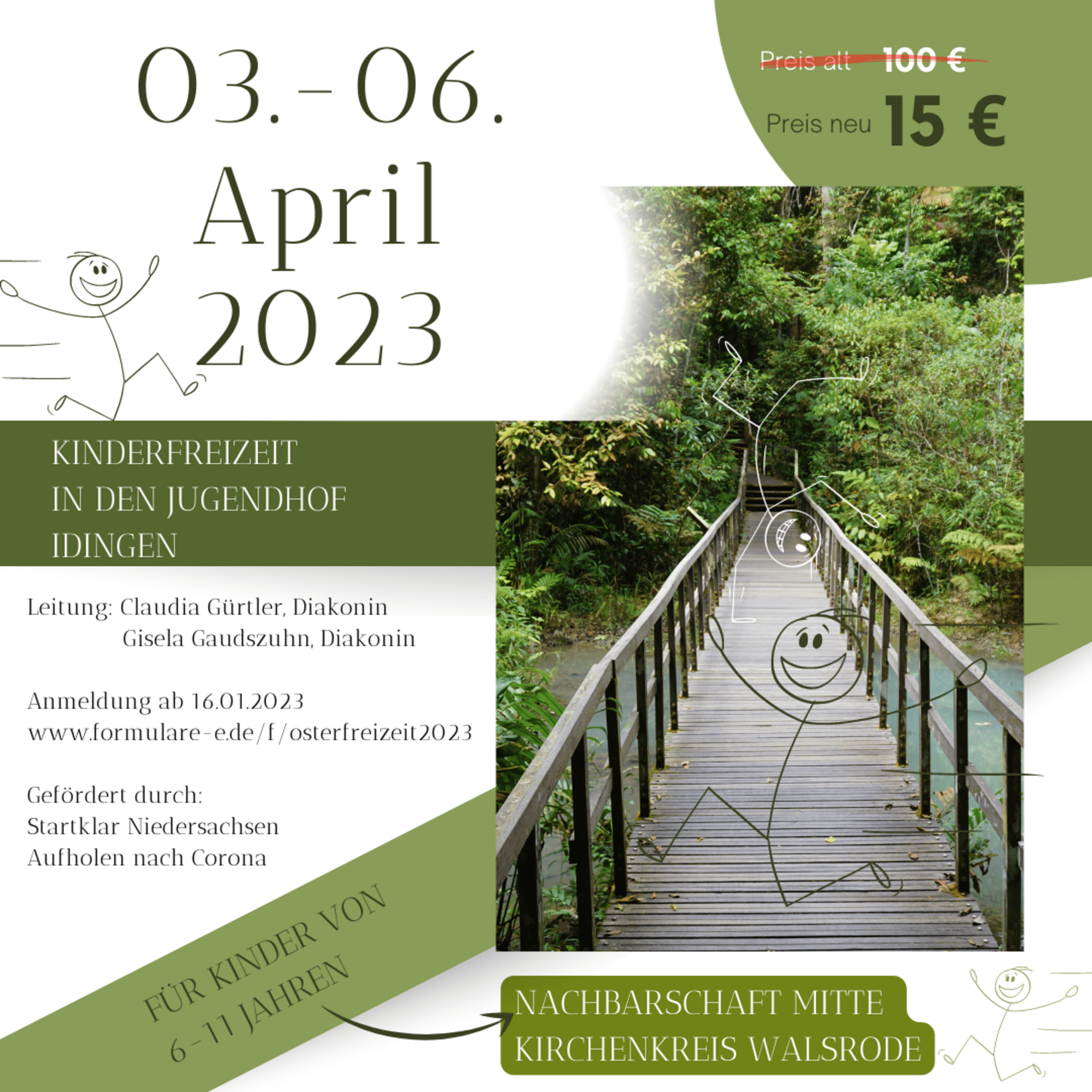 Der eigentliche Preis wäre 100 Euro, aber Dank einer kräftigen Unterstützung durch die Aktion "Startklar Niedersachsen – Aufholen nach Corona" kann diese Freizeit einmalig für 15 Euro angeboten werden. Die Anmeldung ist online möglich ab dem 16. Januar 2023 unter https://www.formulare-e.de/f/osterfreizeit2023