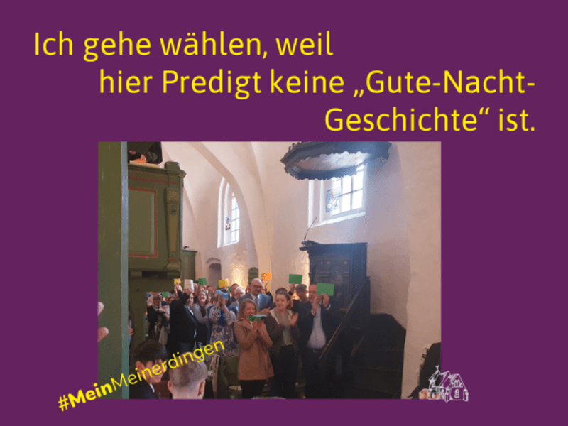 „Wir wollen diesen besonderen Tag nicht anonym laufen lassen und hoffen, dass möglichst viele zur Wahl nach Meinerdingen kommen“, sagt Thomas Delventhal. Vor sechs Jahren lag die Wahlbeteiligung bei 17,5 Prozent, was rund 400 Wählerinnen und Wählern entsprach. Der Durchschnitt in der Landeskirche lag bei 15 Prozent. Möglicherweise erhöht auch die Möglichkeit der Briefwahl die Wahlbeteiligung, weil es ja kaum bequemer möglich ist, an einer Wahl von zu Hause aus teilzunehmen.