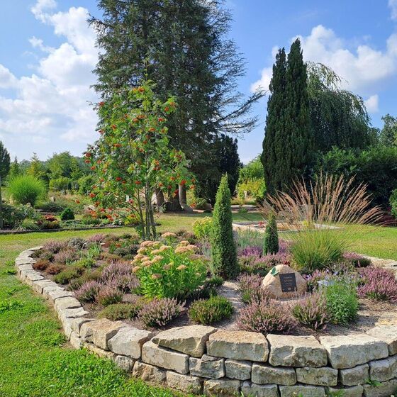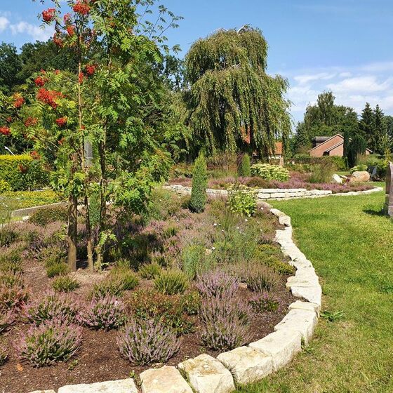 Die Heidepflanze bedeutet für unsere Region Heimat, Natürlichkeit, Verbundenheit. Mitten im organisch, liebevoll gestalteten Garten aus Heide, Eiben, Gräsern und anderen heimischen Pflanzen umgeben von Sandsteinmauern können Urnen beigesetzt werden. Jede Grabstätte erhält einen kleinen Findling als Grabzeichen.